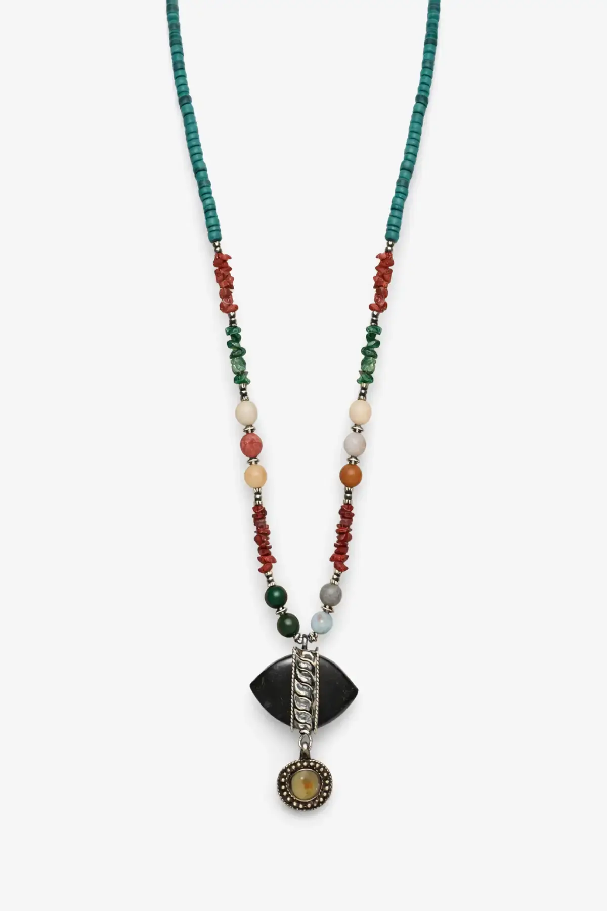 Malzeme: Turkuaz kesme taşlar, mercan parçaları, ahşap boncuklar ve metal sarımlı özel objeler.
