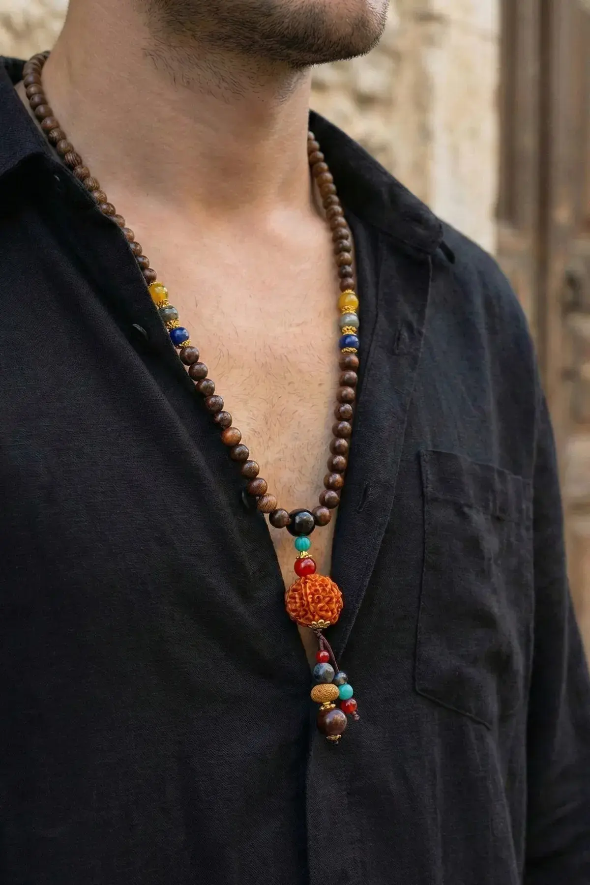 Malzeme: Dokulu sentetik veya doğal ana obje, ahşap boncuklar, renkli doğal taşlar.