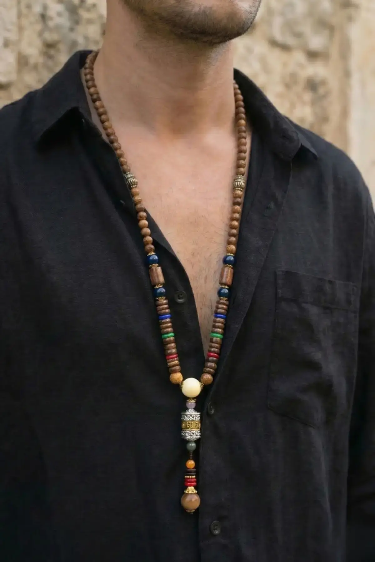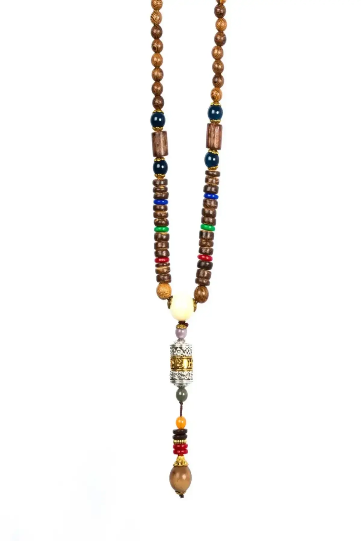 Malzeme: Ahşap boncuklar, gümüş kaplama işlemeli silindir, renkli doğal taşlar (Turkuaz, Akik).