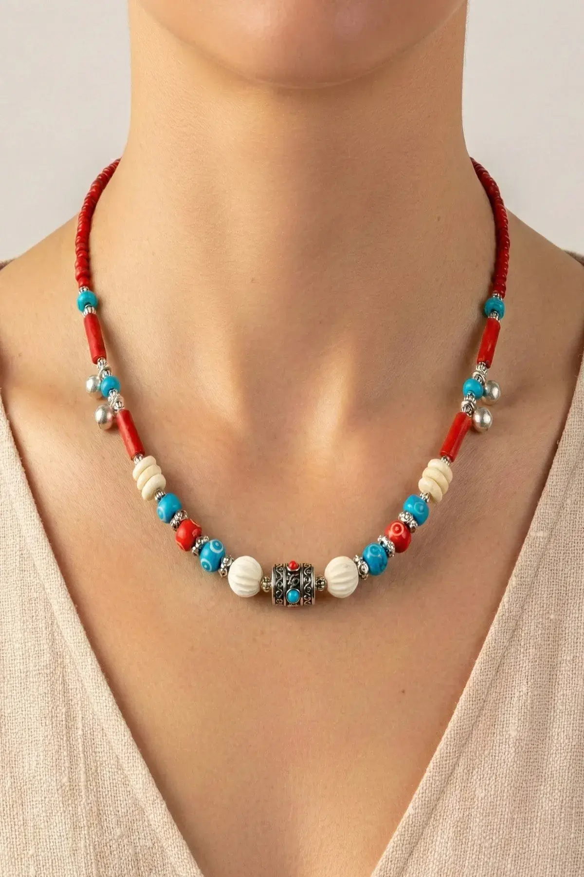 Malzeme: Mercan ve turkuaz görünümlü doğal taşlar, oymalı beyaz boncuklar, gümüş kaplama mine işlemeli aparatlar