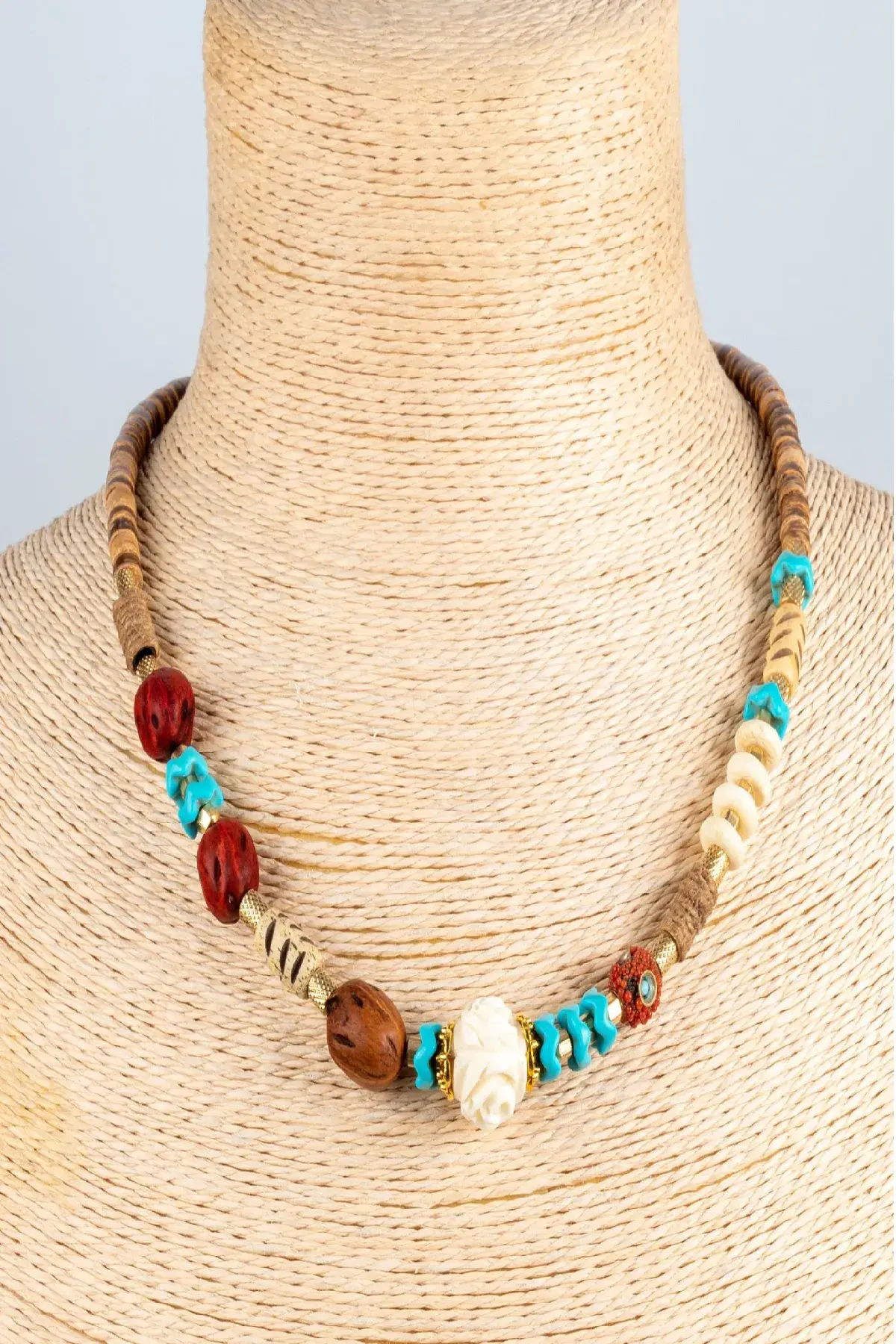 Malzeme: Doğal taşlar, gül figürlü merkez boncuk, ahşap ve tohum boncuklar